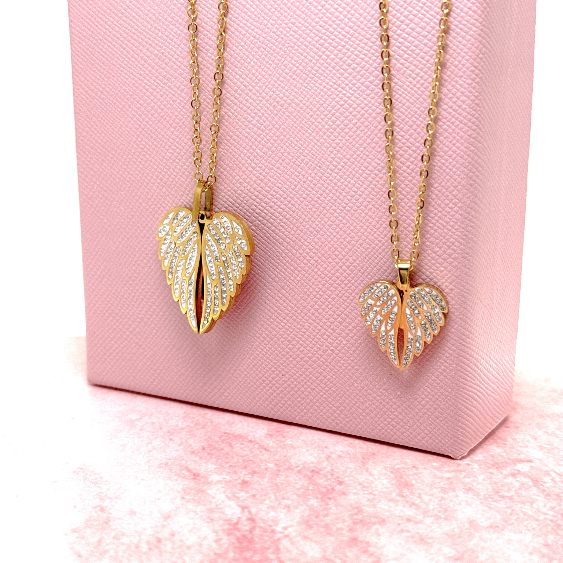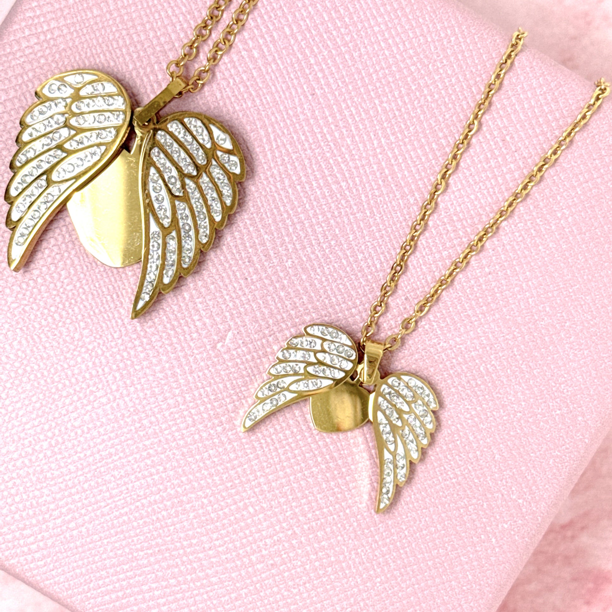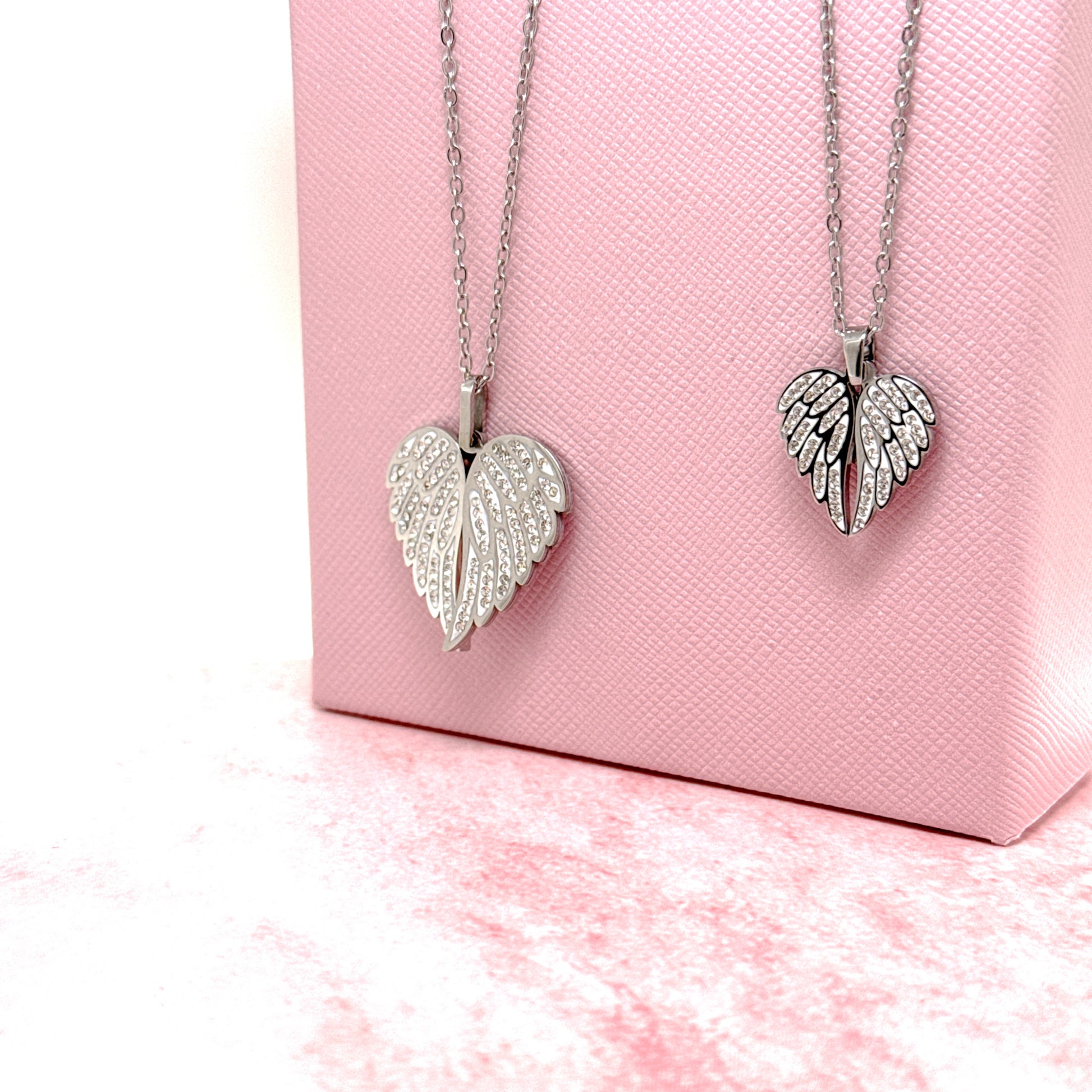 La collana con ali in acciaio 316 è un regalo meraviglioso e delicato che può essere personalizzato con un'incisione sul cuore che esce sotto le ali. Con zirconi bianchi e disponibile in versione grande o mini, è un regalo emozionante per ricordare una persona speciale. Include packaging, incisione e spedizione in tre giorni lavorativi.