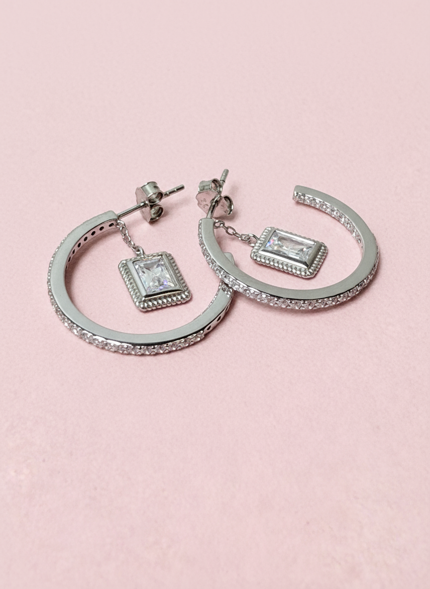 La loro particolarità risiede in una delicata catena che scende dal cerchio, terminando con un pendente che si presenta in due forme: una goccia elegante e un rettangolo moderno. Questa combinazione di forme dona ai cerchi un aspetto unico e contemporaneo, rendendoli diversi dai classici orecchini a cerchio. La luce che attraversa i pendenti accentua ulteriormente la bellezza dell’argento, creando un accessorio che è tanto raffinato quanto audace.