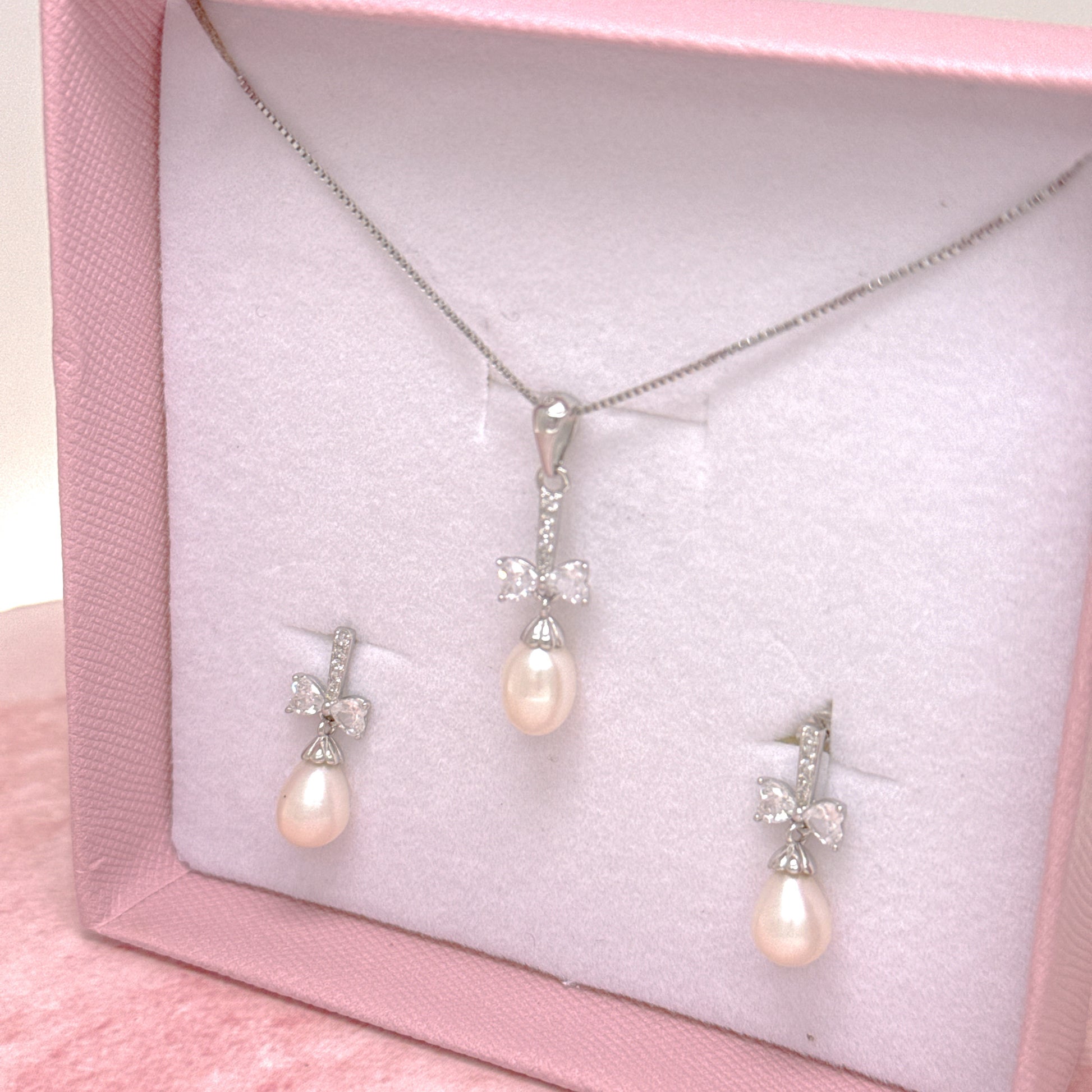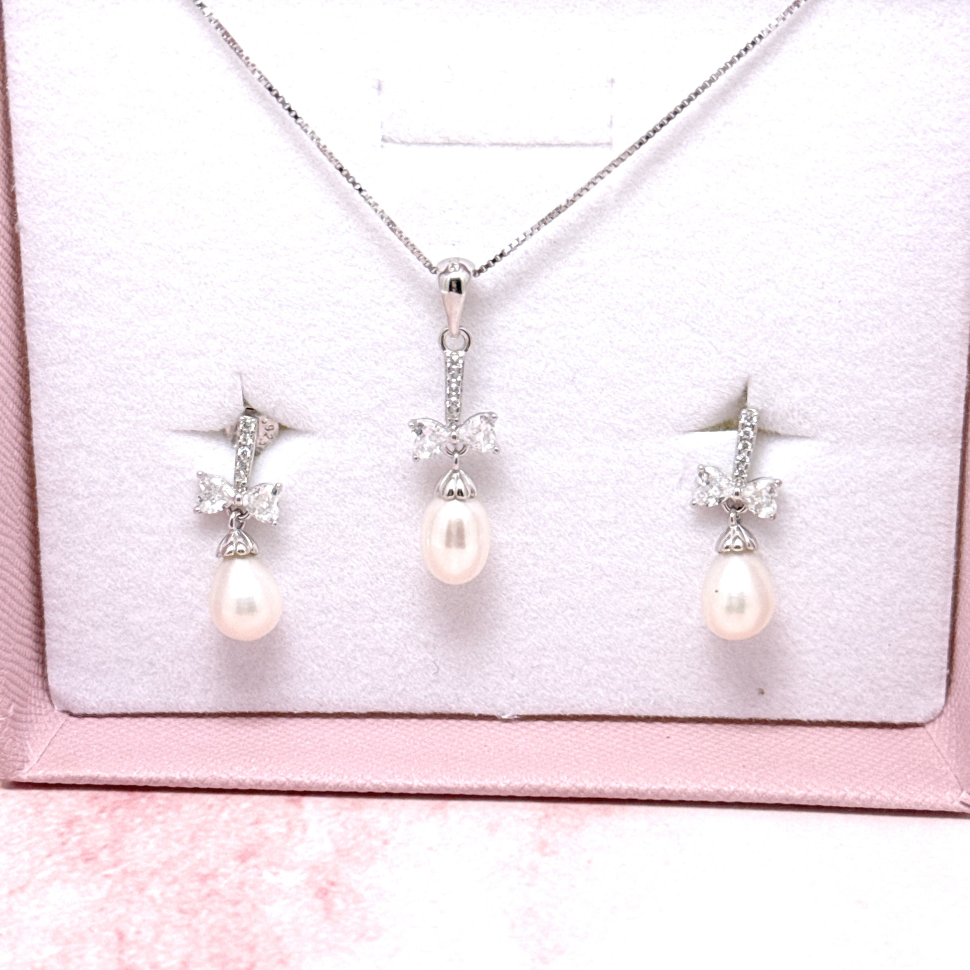 Questa parure di perle con fiocco è perfetta per chi cerca eleganza e raffinatezza. Le perle bianche e i zirconi bianchi la rendono un'opzione ideale per una sposa o come regalo per un evento speciale. Sia collana che orecchini aggiungeranno un tocco di classe al tuo outfit. Gioielli Made in Italy. Accompagnato dal certificato di garanzia.