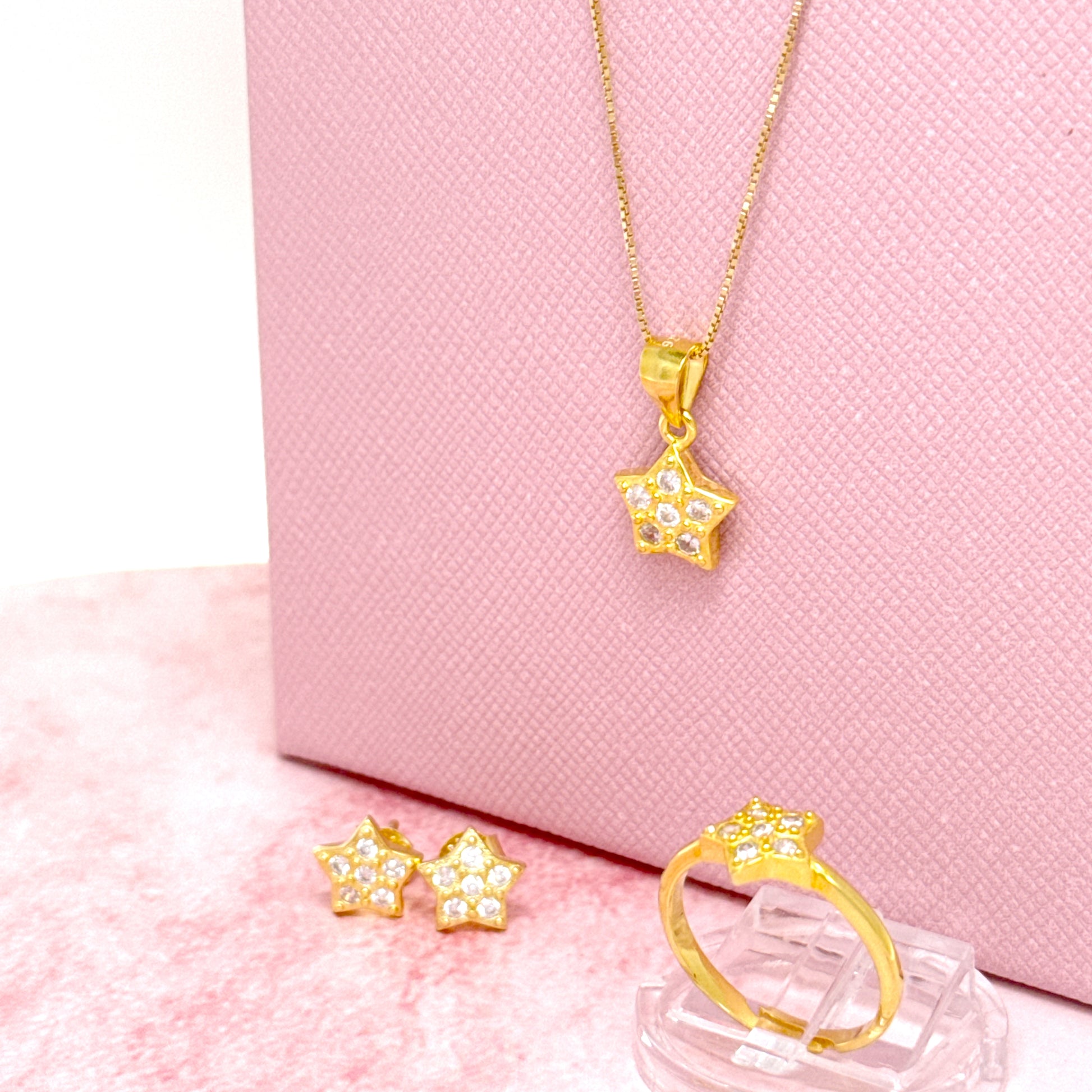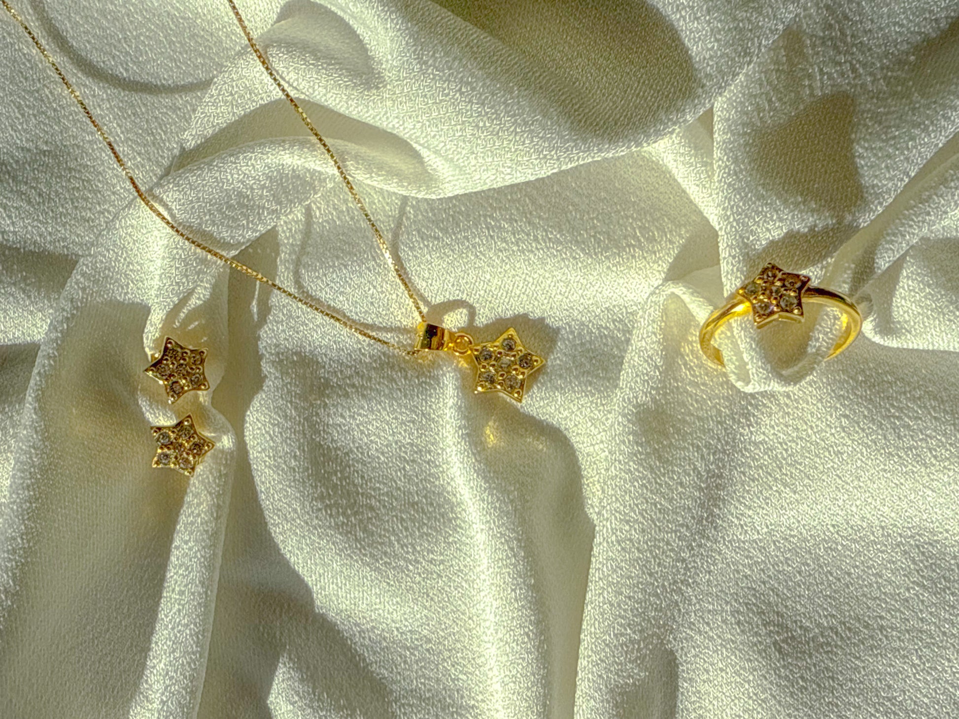 Un grazioso set di gioielli argento Gold, con una piccola stellina di zircone al centro che dona eleganza e semplicità. L'anello regolabile aggiunge un tocco raffinato. Perfetto per chi cerca un tocco di eleganza senza rinunciare alla semplicità.