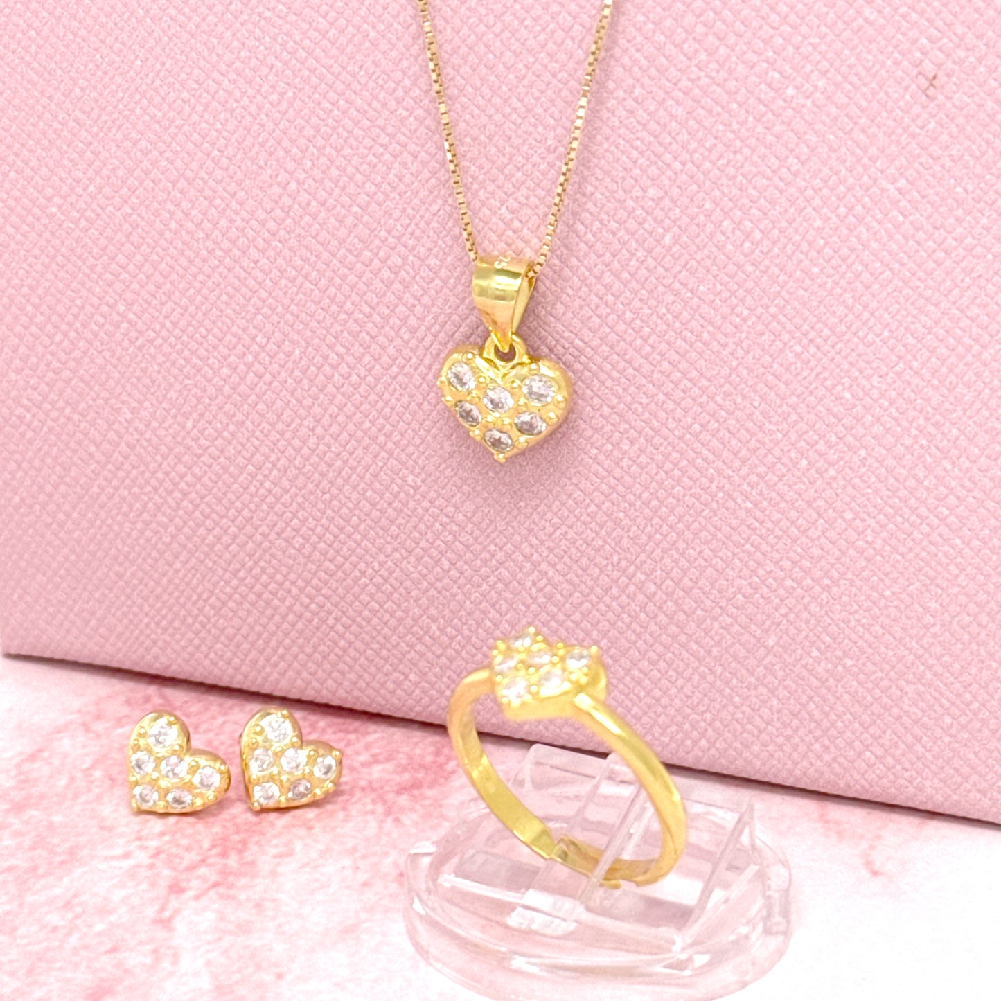 Questa parure cuoricino è elegante, semplice e raffinata. Si tratta di una collana, anello e orecchini con cuoricini al centro, arricchiti da zirconi nati per uno stile unico e luccicante. Regala un tocco di romanticismo e femminilità ad ogni outfit.